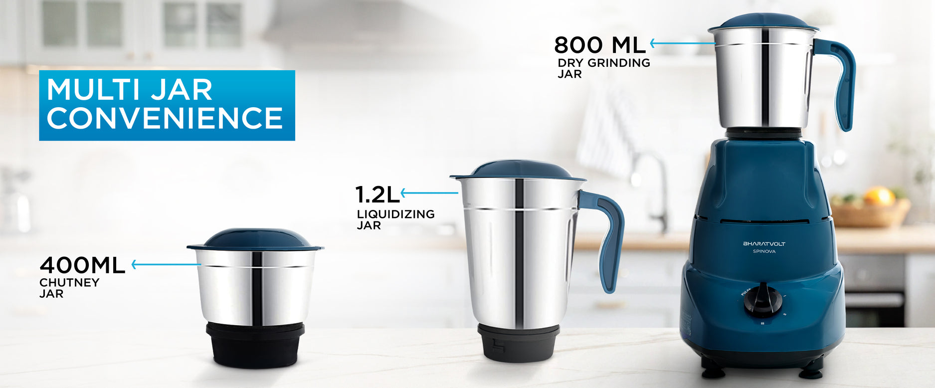 Transform your kitchen into a hub of sleek style, powerful performance and convenience with the BharatVolt Spinova Mixer Grinder. From quick chutneys and aromatic masalas to creamy smoothies and perfect fluffy batters, Spinova makes every task effortless while ensuring long-lasting reliability. Your perfect kitchen partner for taste, ease, and durability.